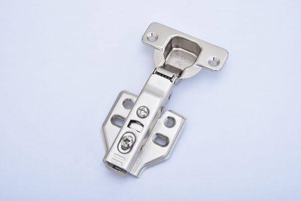 + Bản lề 1/2 cong nhẹ (semi-bent): Đây là loại bản lề có kết cấu cong 1/2 dành cho cửa tủ chỉ cần che một nửa độ dày của vách gỗ. Hay nói cách khác là dùng chung cho 2 cửa tủ liền kề tường.